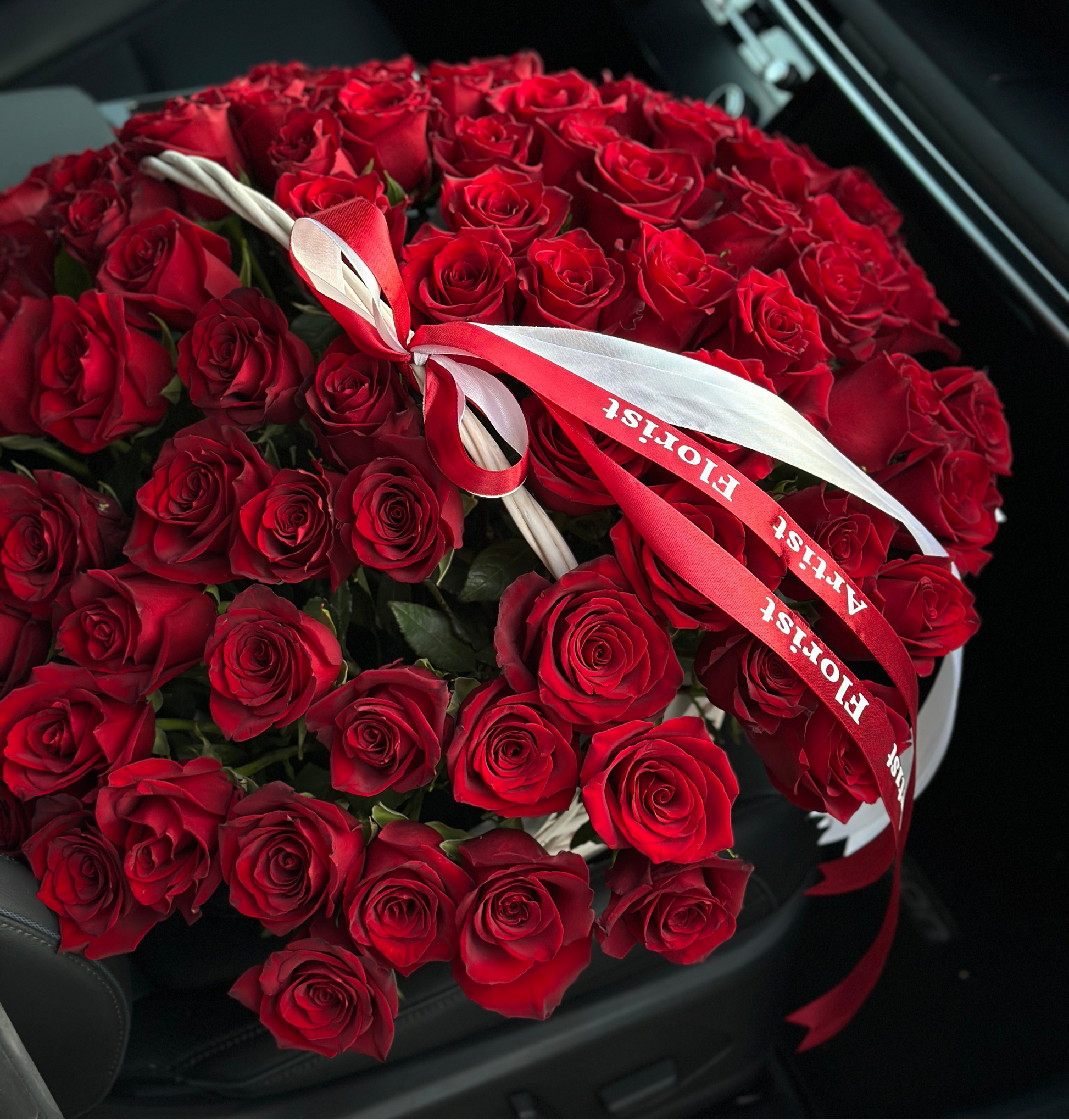 A luxury basket of 100 premium long-stem red roses – the ultimate romantic gift.