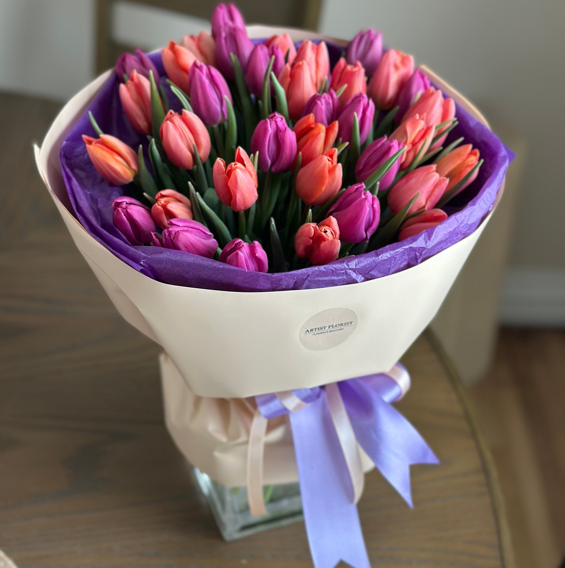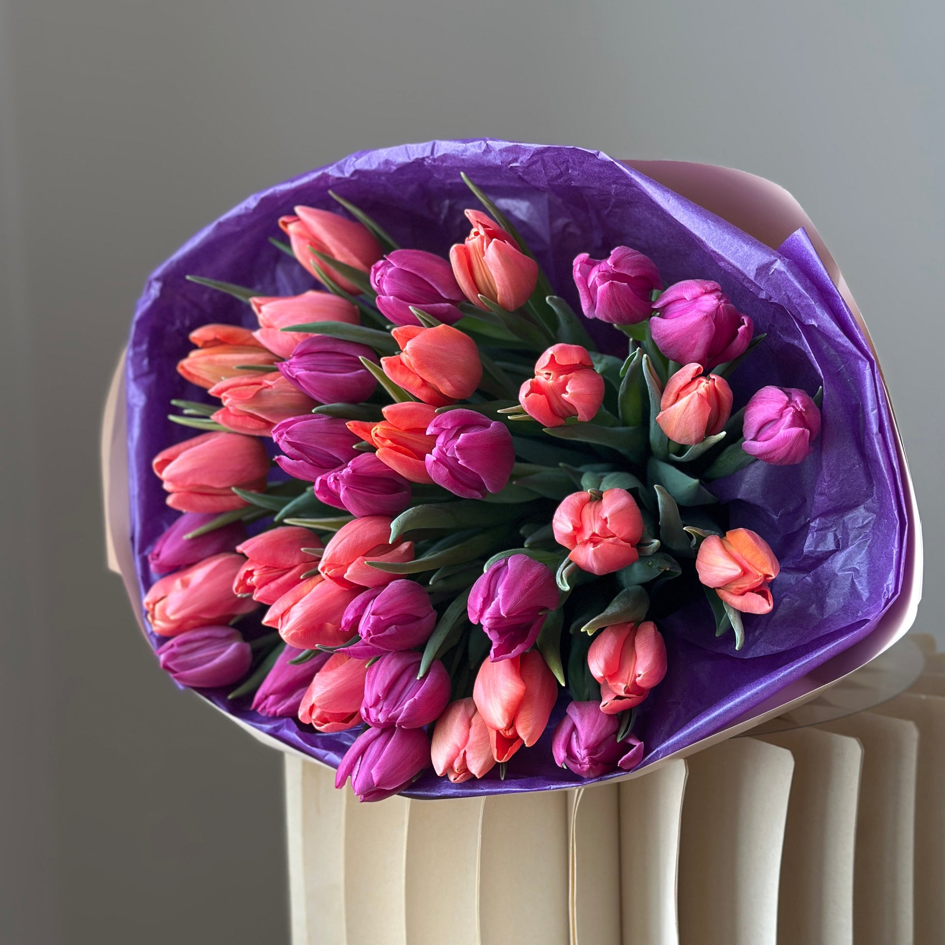 A vibrant bouquet of 35 fresh purple and orange tulips, locally grown in Winnipeg. This bright spring arrangement features premium tulips carefully wrapped in our signature style, perfect for birthdays, celebrations, or a thoughtful surprise.