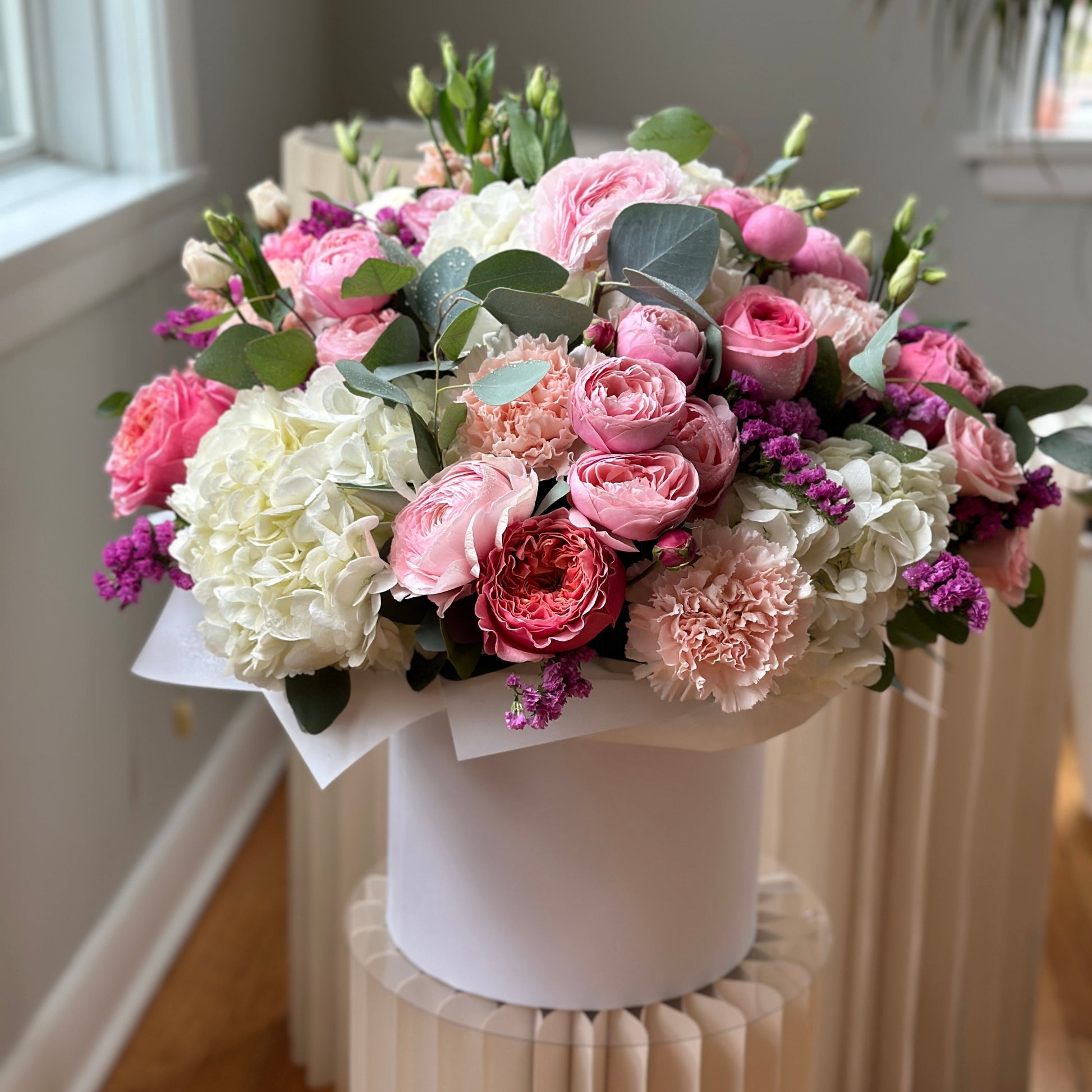 Hydrangea, ranunculus,peony roses, peony spray roses , alstroemerias, carnations, lisianthus and eucalyptus