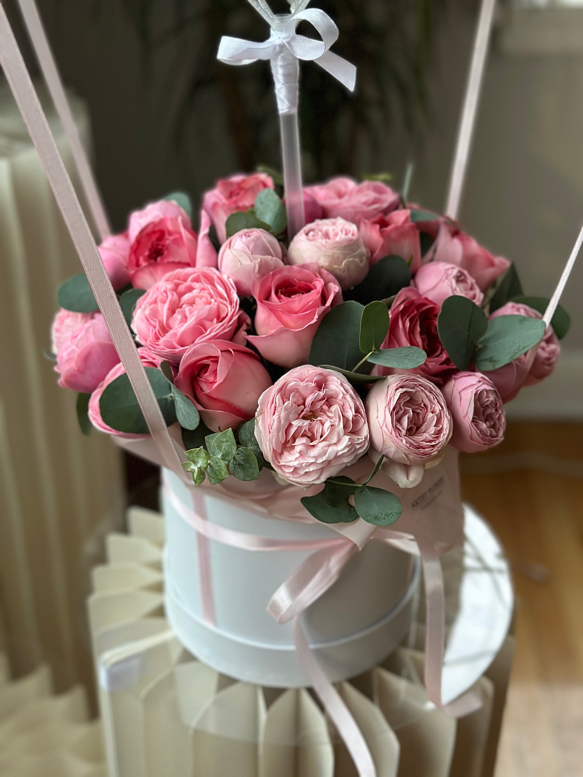 Arrangement of peony roses & eucalyptus with bobo balloon 18 inches decorated individual inscription and bows