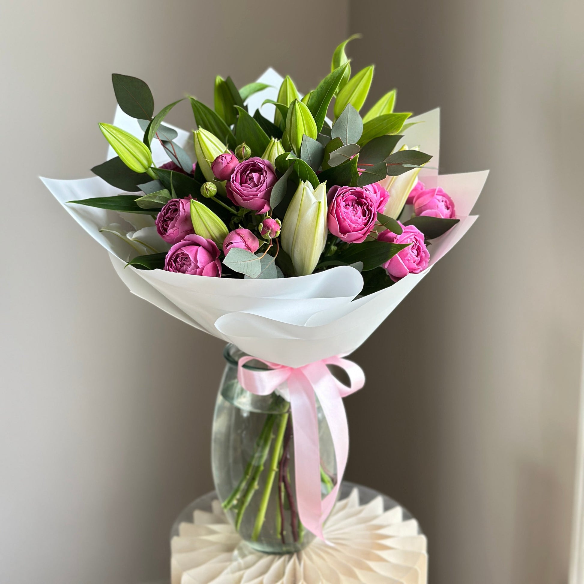 Whisper of Light is a graceful bouquet that blends the purity of lilies with the romantic charm of spray garden roses in gentle pastel tones. This arrangement is designed to convey warmth, peace, and elegance. It’s an ideal choice for expressing sympathy, care, or simply bringing calm beauty into someone’s day.