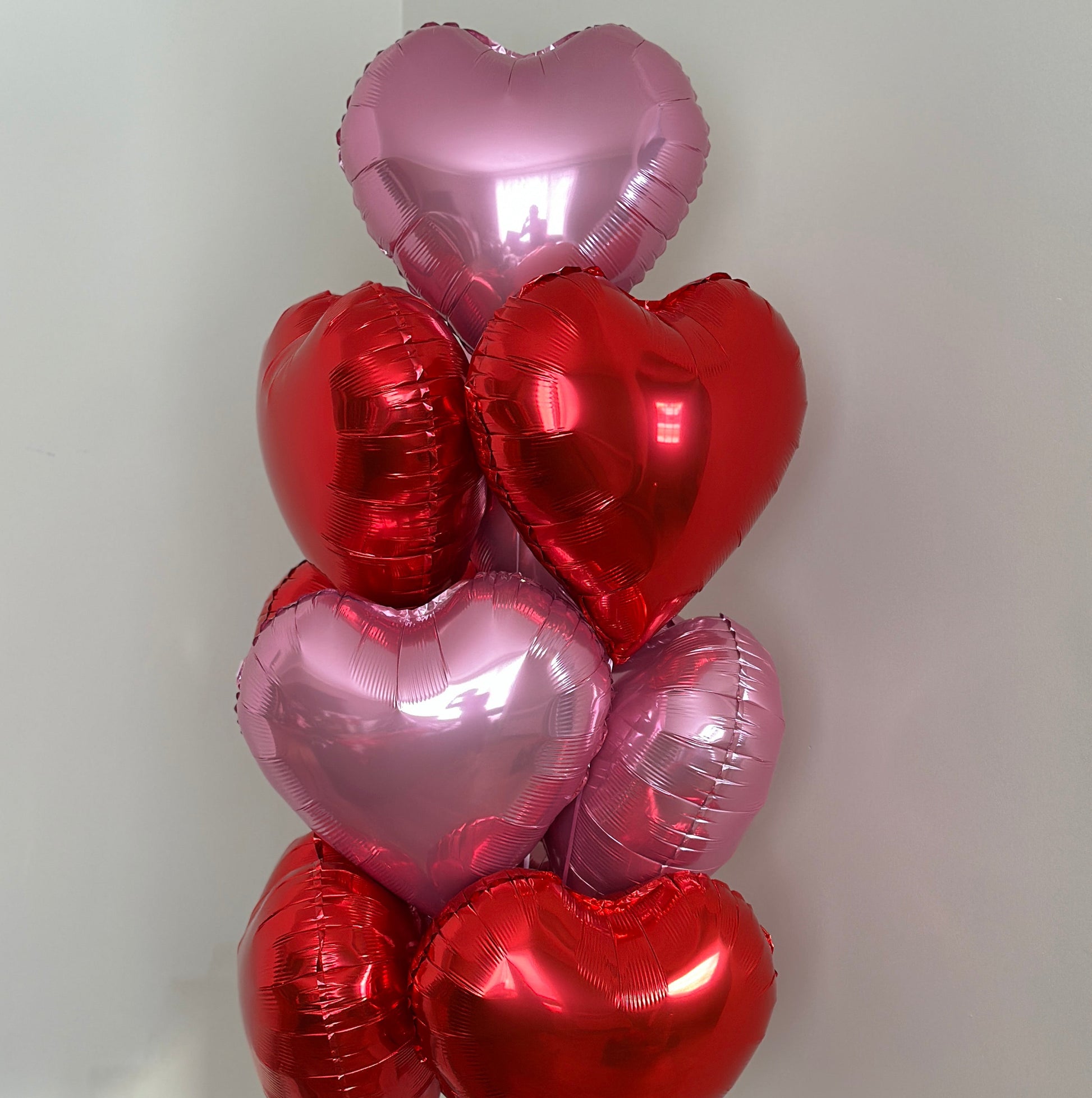 Set of 10 heart-shaped foil balloons in pink and red colors.