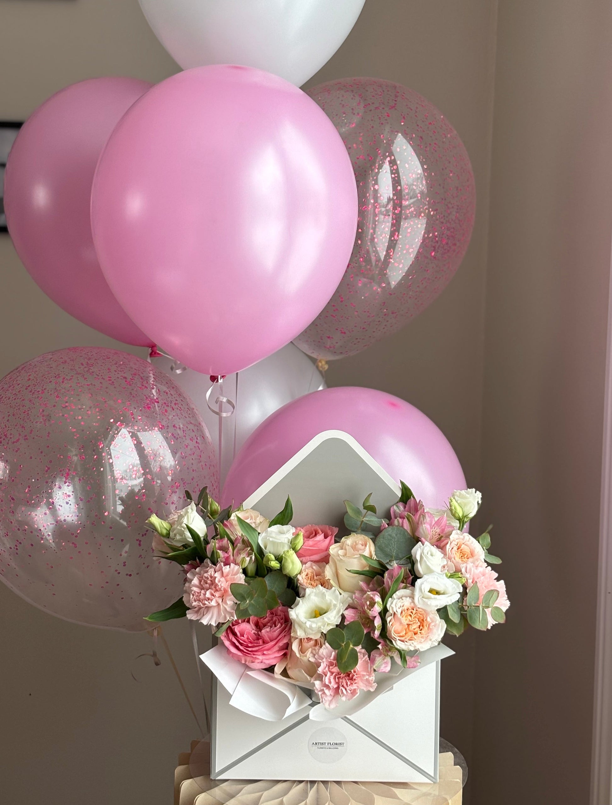 Send a heartfelt message with our “Love Letter” set, featuring an envelope-style arrangement of mixed flowers such as roses, peony roses, alstroemerias, lisianthus, and eucalyptus, accompanied by 7 12-inch latex balloons.