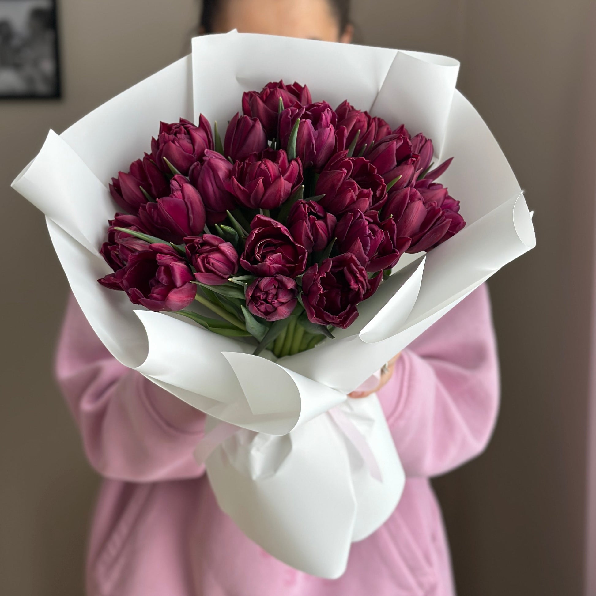 Spring bouquet of 25 double purple tulips wrapped in our signature style